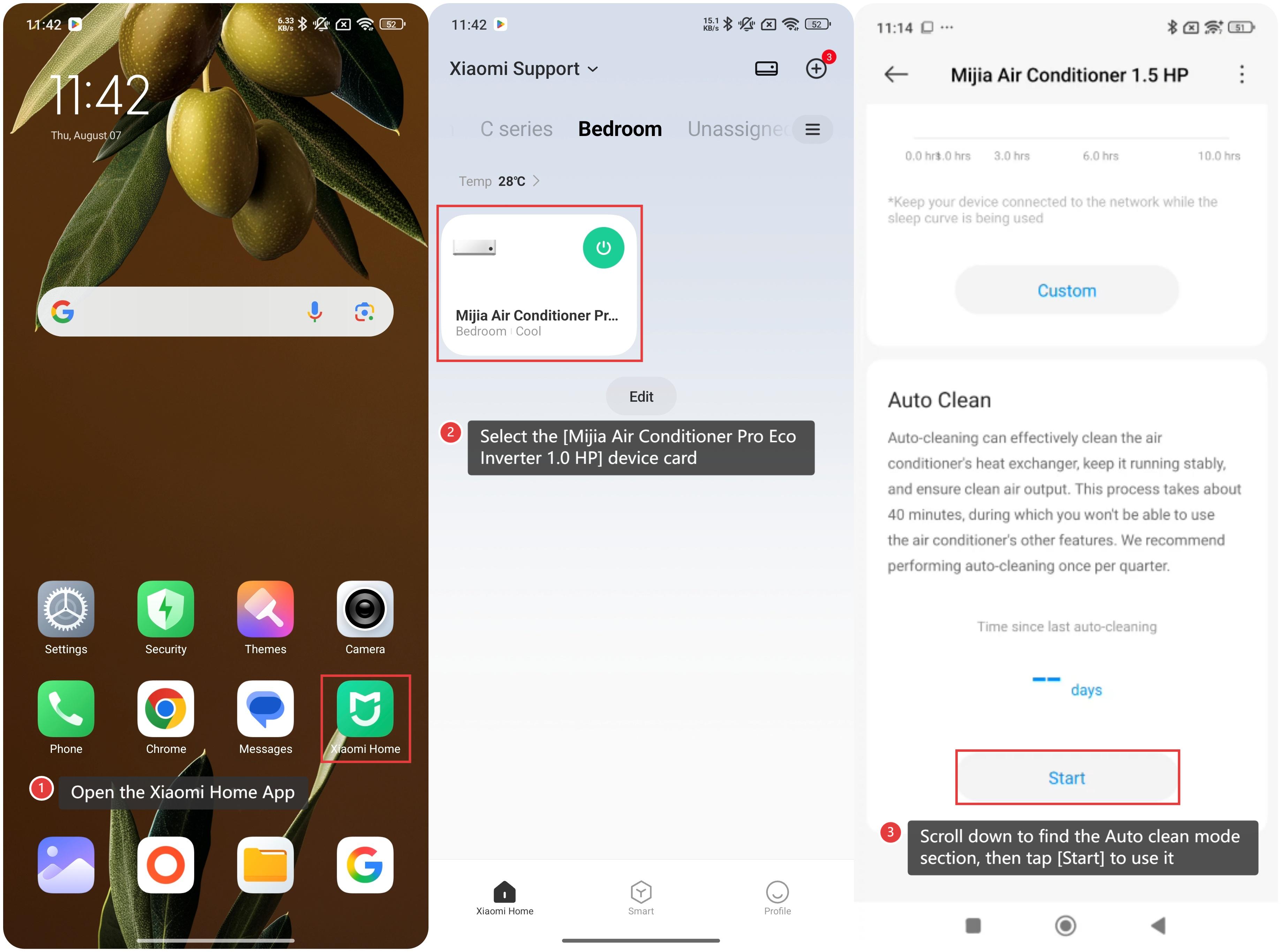 Khi Mijia Air Conditioner Pro Eco Inverter 1.0 HP tắt, nhấn và giữ đồng thời nút [ECO] và [Hẹn giờ] trên điều khiển từ xa trong 3 giây để kích hoạt chế độ Tự động làm sạch. Quá trình Tự động làm sạch mất khoảng 40 phút.