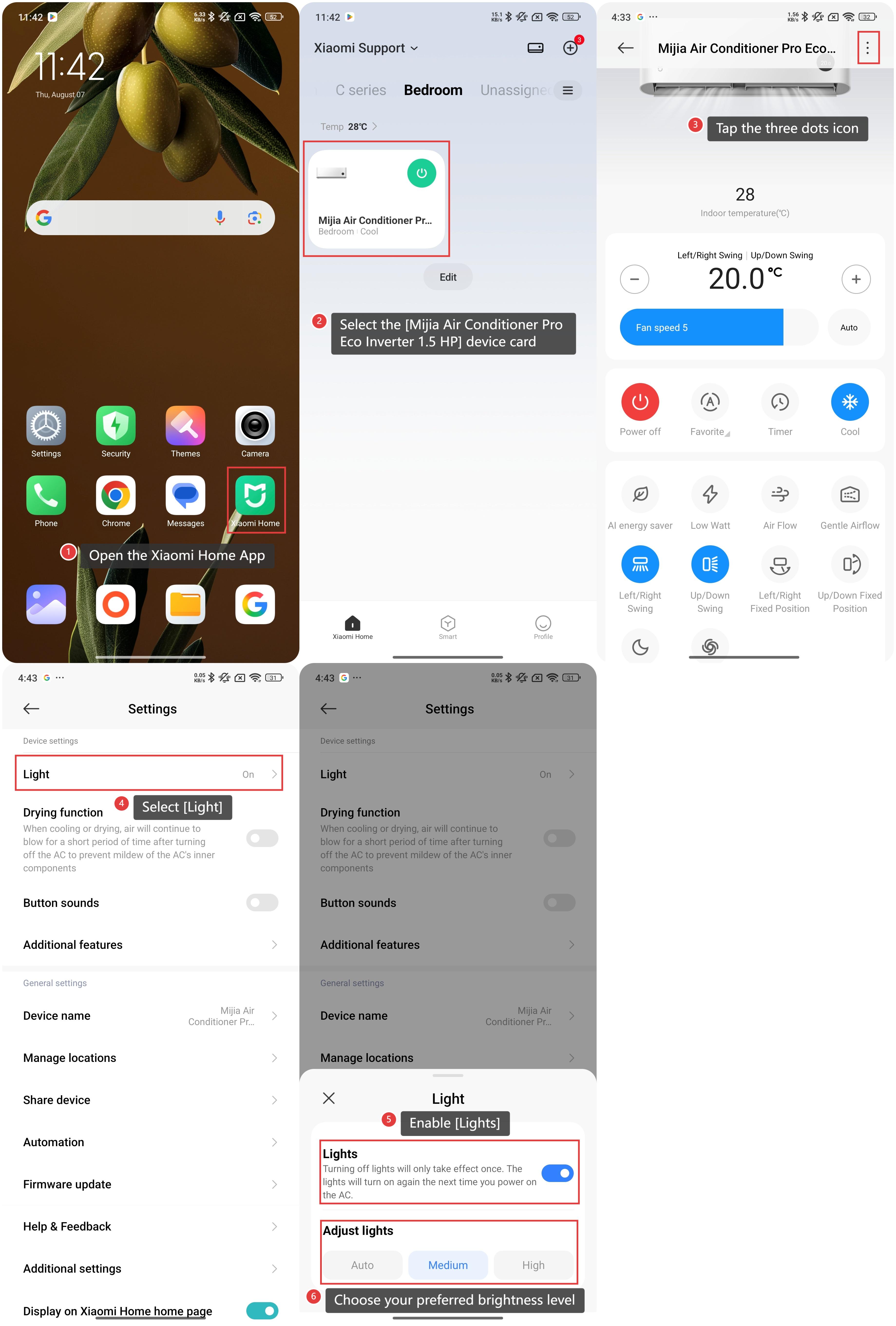 Để điều chỉnh độ sáng màn hình trên Mijia Air Conditioner Pro Eco Inverter 1.5 HP thông qua Xiaomi Home App, vui lòng tham khảo các thông tin sau: