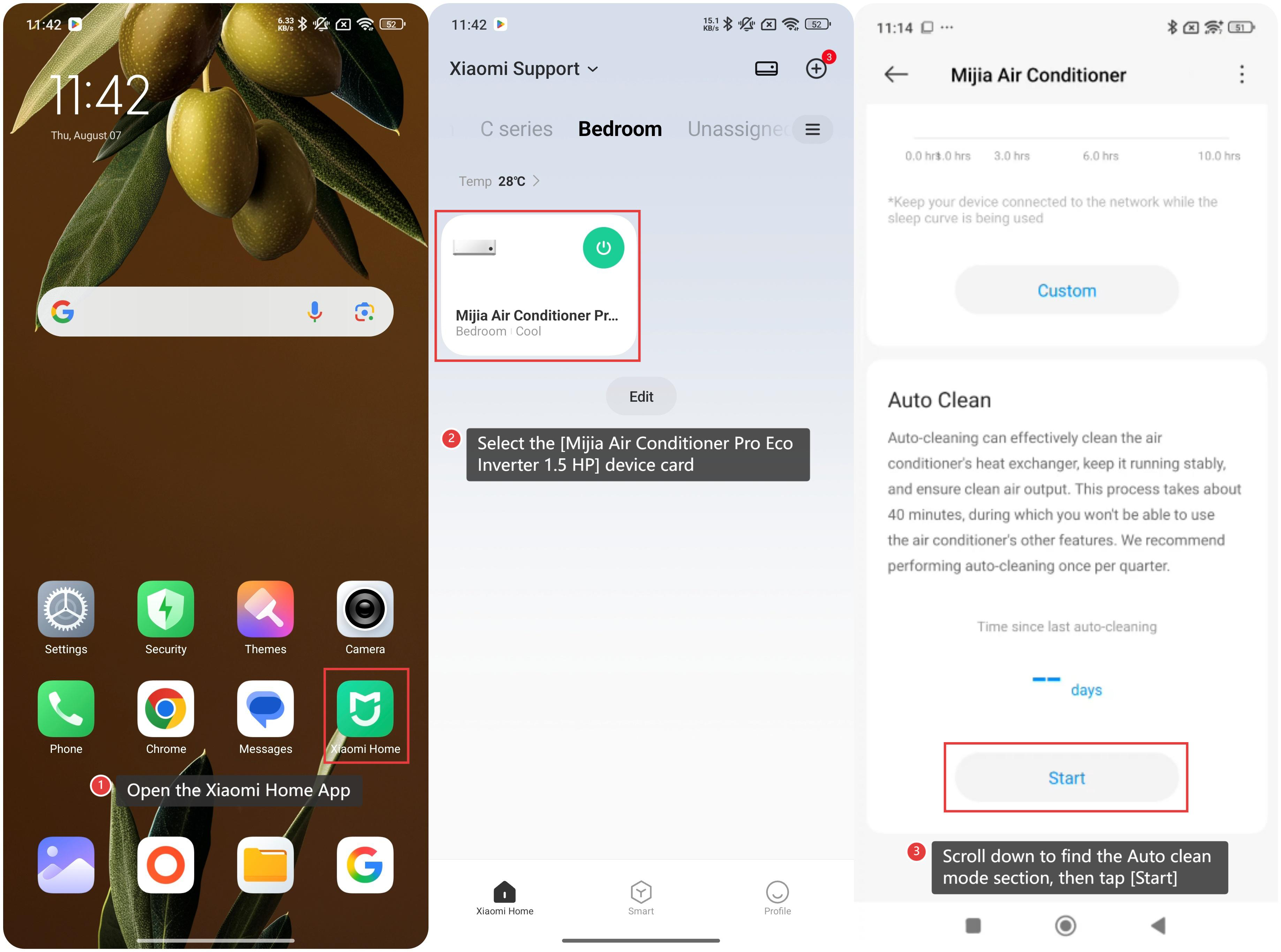 Để sử dụng chức năng Tự động làm sạch của Mijia Air Conditioner Pro Eco Inverter 1.5 HP thông qua Ứng dụng Xiaomi Home, vui lòng tham khảo các thông tin sau: