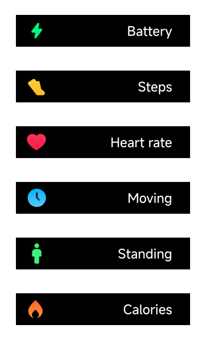 Các biểu tượng chức năng là Pin, Số bước, Nhịp tim, Di chuyển, Đứng và Lượng calo.