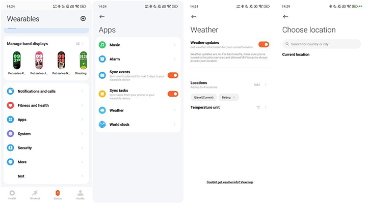 Điện thoại Android: Vào Ứng dụng Mi Fitness >> [Thiết bị] >> [Ứng dụng] >> [Thời tiết] và làm mới sau khi vào hoặc nhấn vào thành phố để định vị lại;