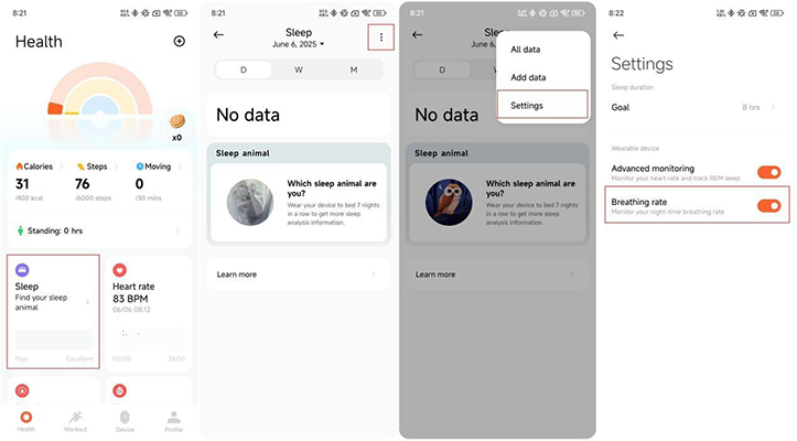 Nhịp thở trong khi ngủ: Khi dây đeo phát hiện ra rằng bạn đang ngủ, nó sẽ tự động theo dõi nhịp thở trung bình của bạn. Bạn có thể view dữ liệu trong Ứng dụng Mi Fitness >> [Sức khỏe] >> [Ngủ] >> [D] >> [Nhịp thở trung bình] hoặc view nó bằng cách đi tới danh sách Ứng dụng của ban nhạc >> [Ngủ] >> [Cài đặt] >> [Nhịp thở];