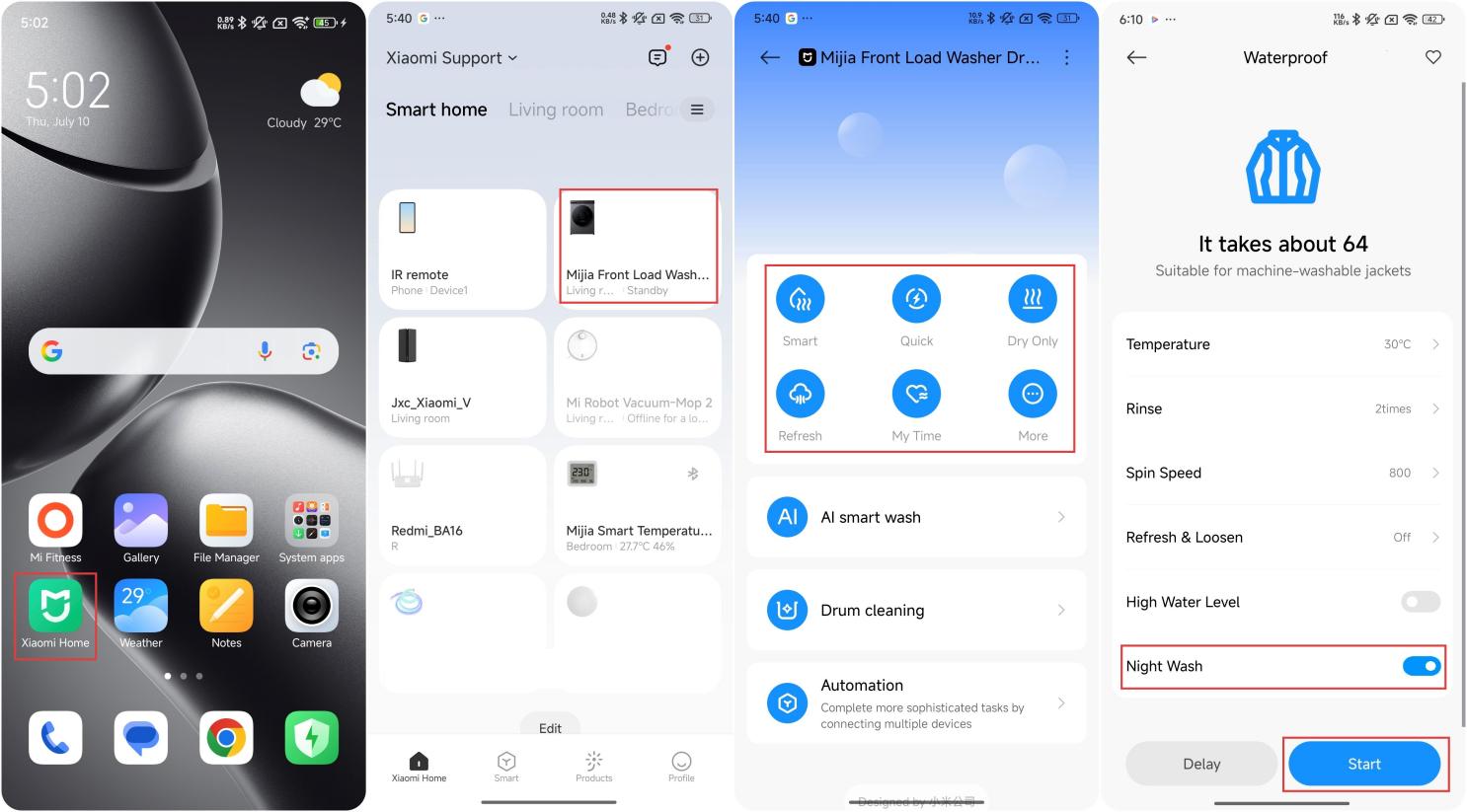 Để bật tính năng Giặt ban đêm của Máy giặt sấy cửa trước Mijia Front Load Washer Dryer 10.5kg, vui lòng tham khảo các bước sau:
