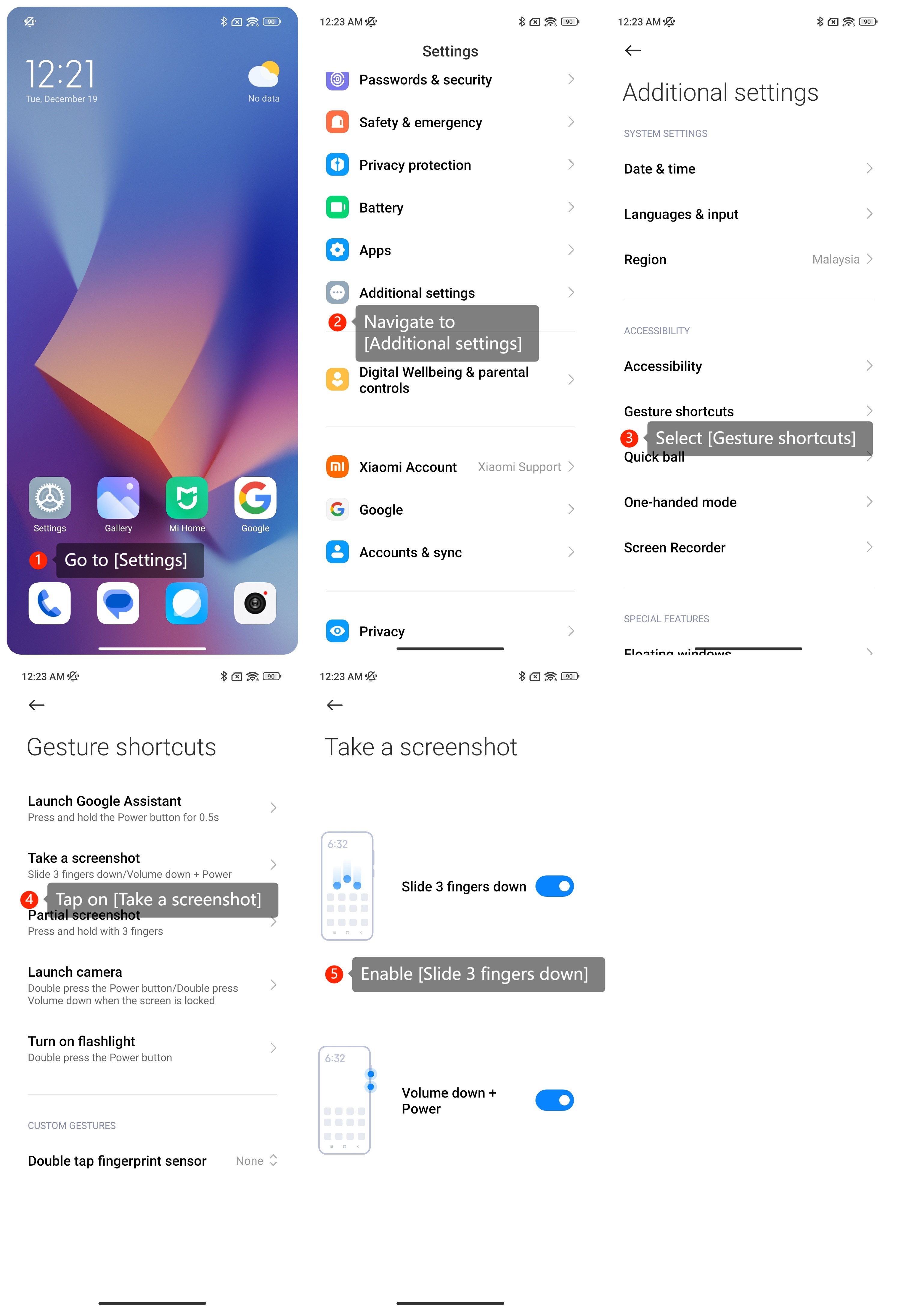 (2). Bạn có thể vuốt màn hình xuống bằng ba ngón tay để chụp ảnh màn hình bằng cách vào [Cài đặt] >> [Cài đặt bổ sung] >> [Phím tắt cử chỉ] >> [Chụp ảnh màn hình] >> [Trượt 3 ngón tay xuống].