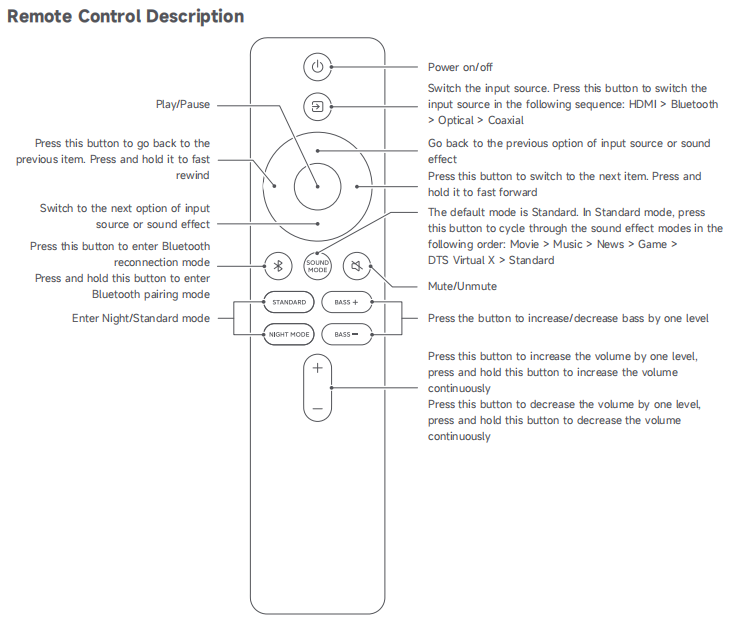 Q4: Điều khiển từ xa của Xiaomi Soundbar Pro 2.1 ch có những nút nào?